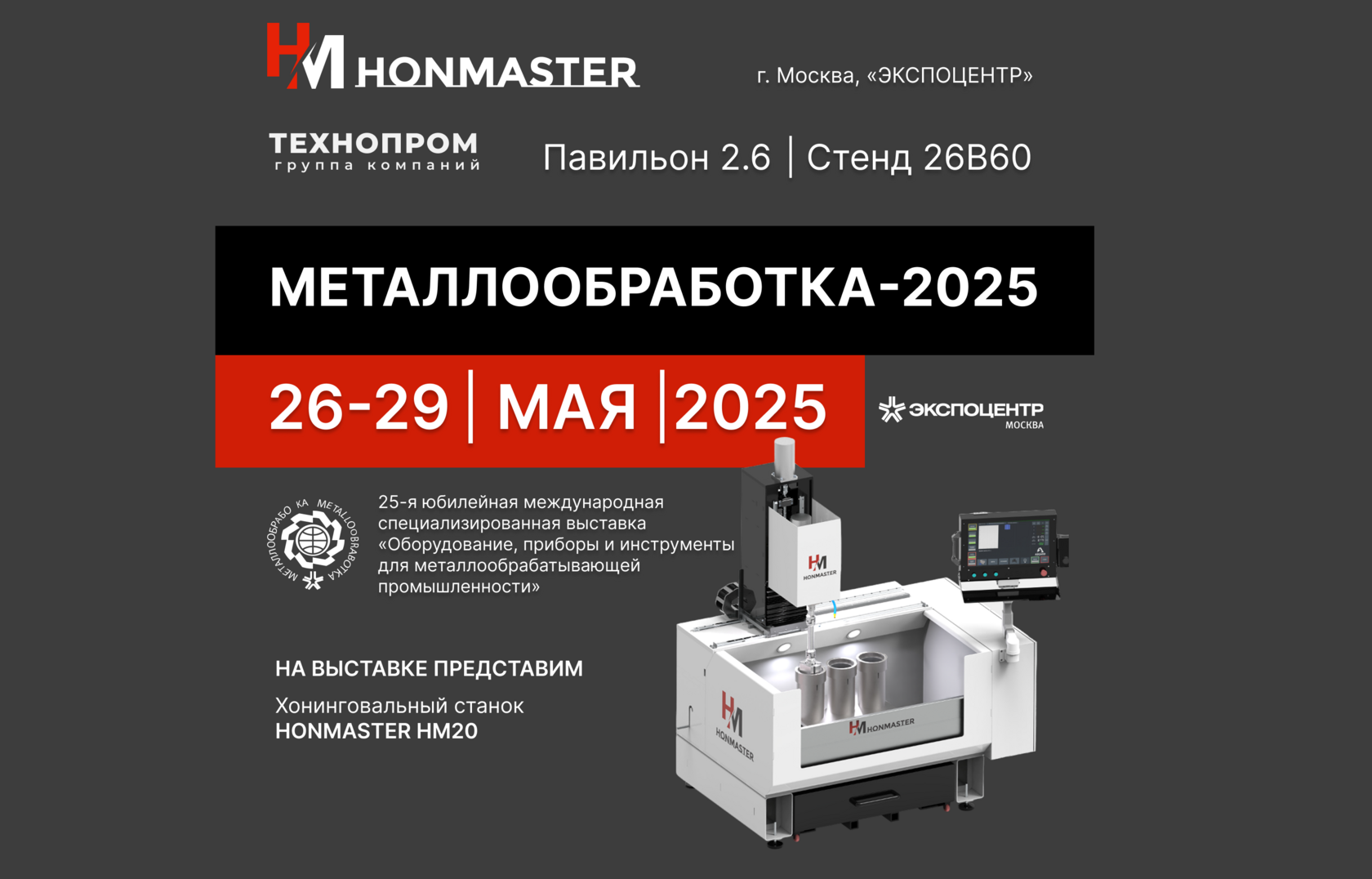 Компания "Хонмастер" приглашает вас посетить наш стенд группы компаний ТЕХНОПРОМ на крупнейшей отраслевой выставке «Металлообработка 2025», которая пройдет в Москве ЦВК «ЭКСПОЦЕНТР»